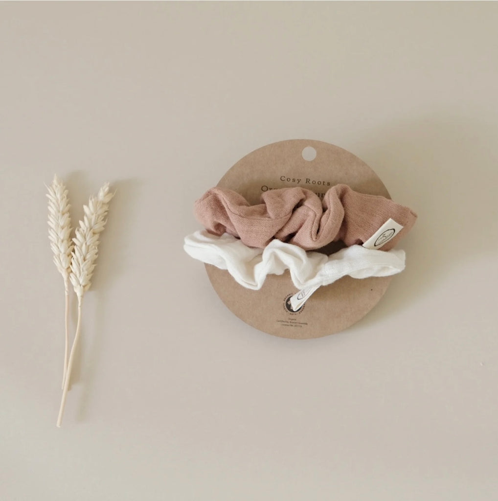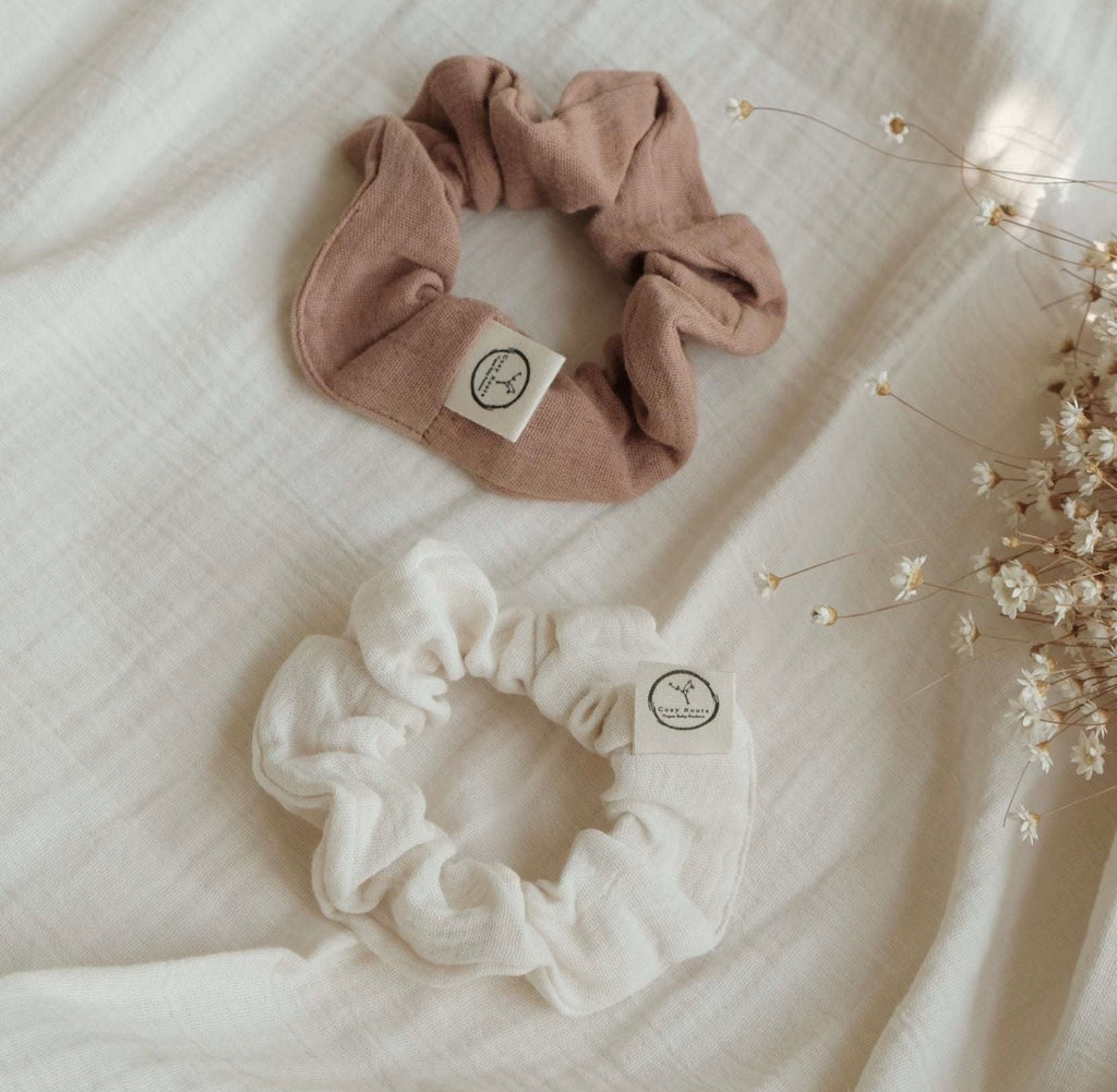 Wunderschöne und kuschelig weiche Scrunchies aus GOTS-zertifizierter Bio Baumwolle in unseren exklusiven Farben Walnut/Sand.