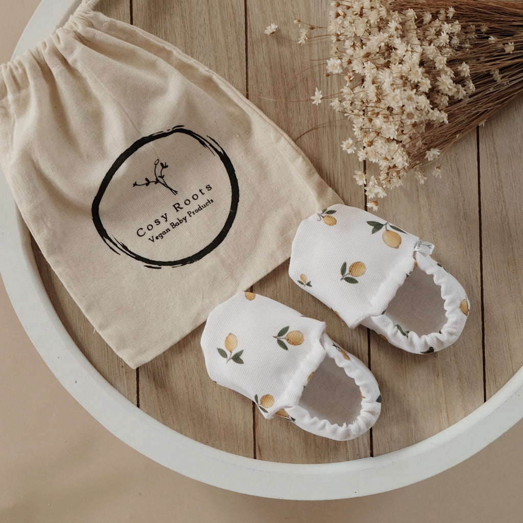 Pure Lemon! Mit diesen veganen Babyschuhen im trendigen Zitronen Design eroberst Du die Welt. Schnapp´ auch Du dir diese kuschelweichen Schühchen und Du bist perfekt ausgestattet für einen spannenden Tag. Die nachhaltigen Schuhe passen sich optimal Deinen Füßen an und fördern Deine gesunde Entwicklung. Es ist fast wie barfußlaufen nur mit dem Schutz aus samtweichen und recycelten Materialiem.